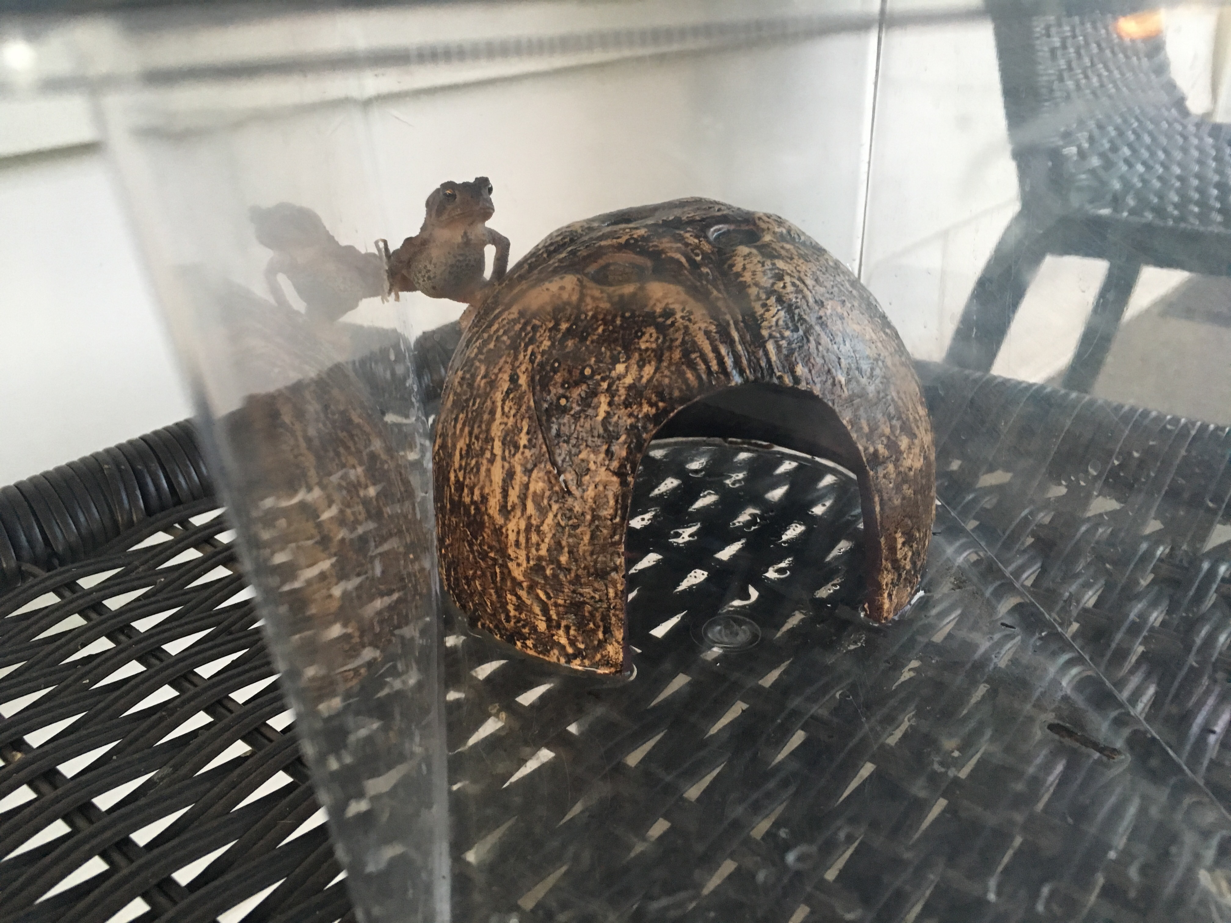 See, this gentleman here was found in a hole. He managed to dodge a shovel digging in a small garden, because the whole thing is to be removed and paved with stones. I captured it, and asked for ransom. I wanted his toadstone, but it was a family heirloom. I gave him a plastic half coconut that no other amphibian but him had used properly.
